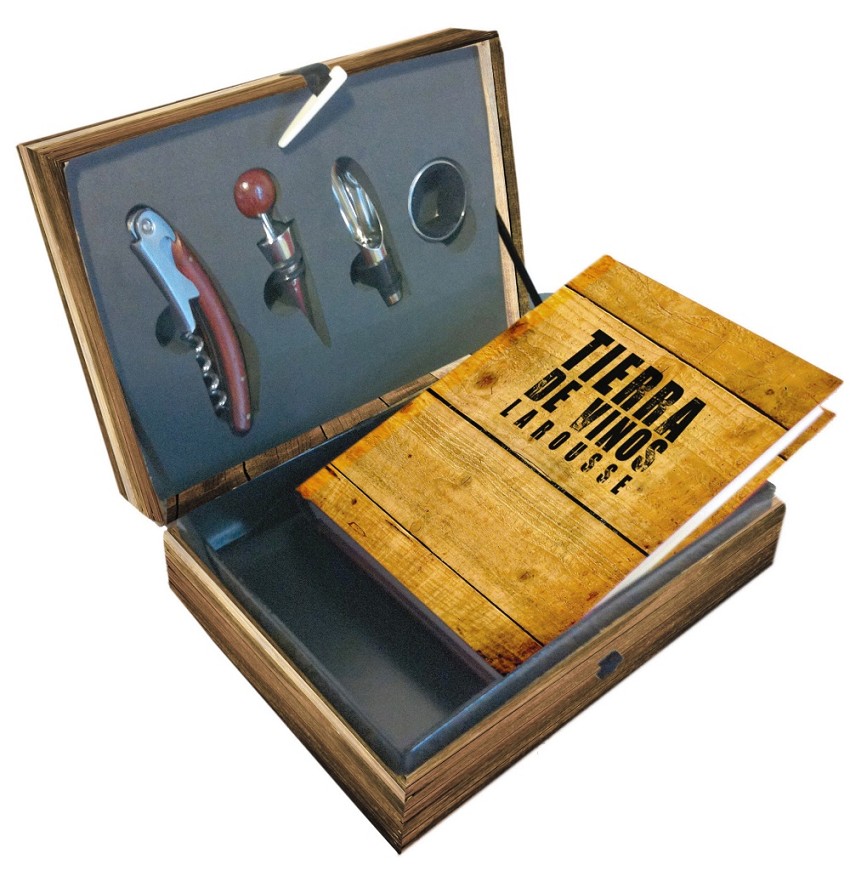 «Tierra de Vinos» se ofrece en una lujosa presentación en estuche acompañado de un sacacorchos, un dosificador anti-goteo, un tapón y un anillo recoge-gotas.