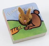 Libro todo cartoné con una divertida marioneta de dedo con forma de conejito inserta en su interior.